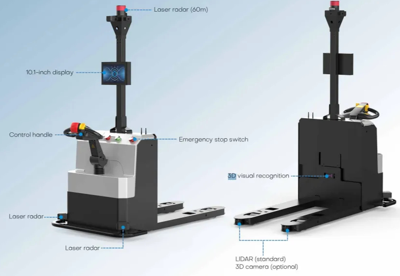 Ironhide - Autonomous forklift supporting a maximum load of 1.5T, laser SLAM navigation, no need for reflectors, with a variety of sensors such as 3D obstacle avoidance, safety edge of the touch for 360° three-dimensional safety protection, is the pallet cargo handling, material transport and other work needs of the right choice.